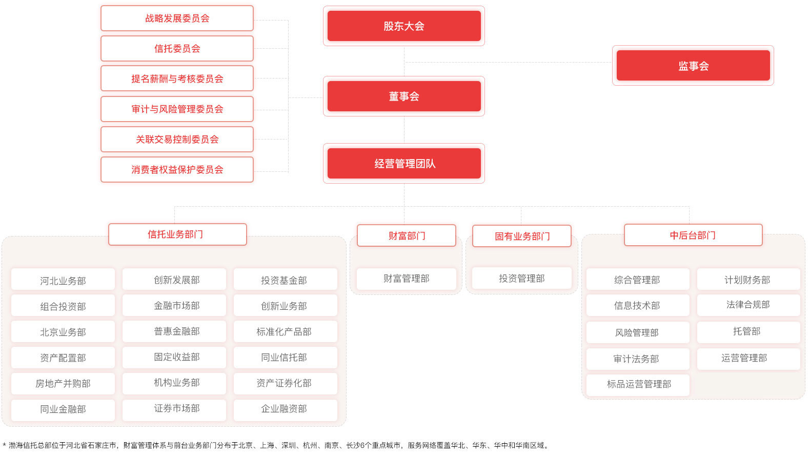 渤海國際信托股份有限公司(以下簡稱:渤海信托)成立于1983年12月,公司前身為河北省國際信托投資有限責任公司,2006年重組并引入市場化機制,2015年7月更名為渤海國際信托股份有限公司,2017年公司注冊資本增至36億元,是唯一一家注冊地在河北省的信托機構。公司本科及以上學歷人員占比99%,黨員占比44%,設有省級博士后創新實踐基地。截至2024年末,公司總資產148.84億元,凈資產133.89億元,管理信托資產規模5436.23億元,業務范圍覆蓋全國主要省市。
